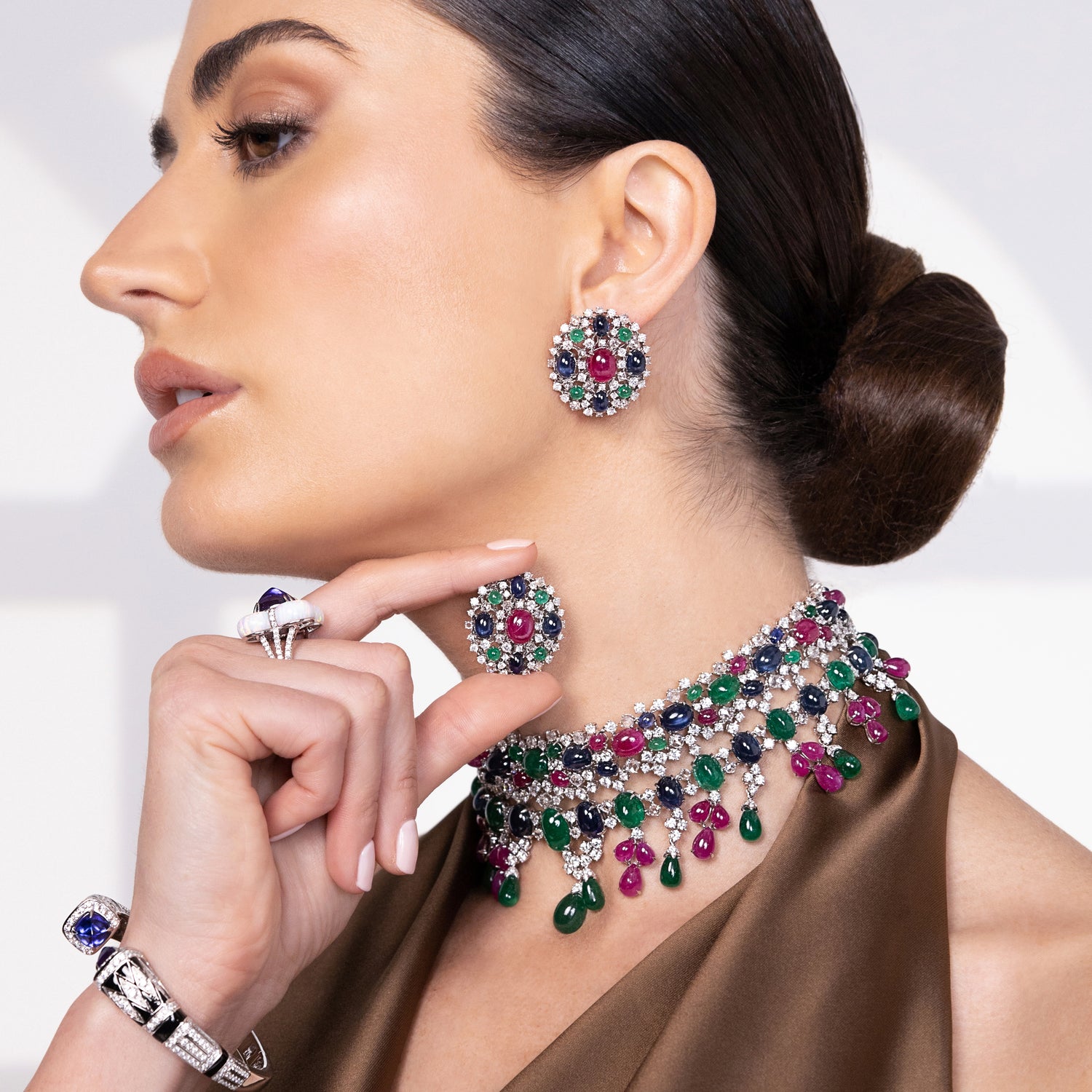 A triage of rubies, emeralds, and sapphire beads unite in the form of an Art-Deco inspired choker.