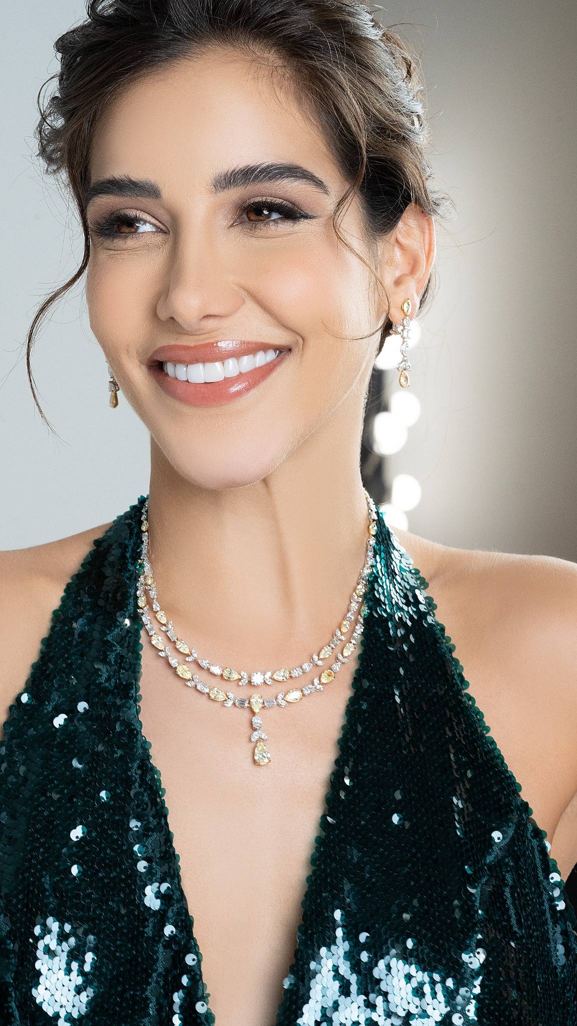 A double-line soiree of white and yellow diamonds. Contrasted to perfection, and adaptable to all dress styles.