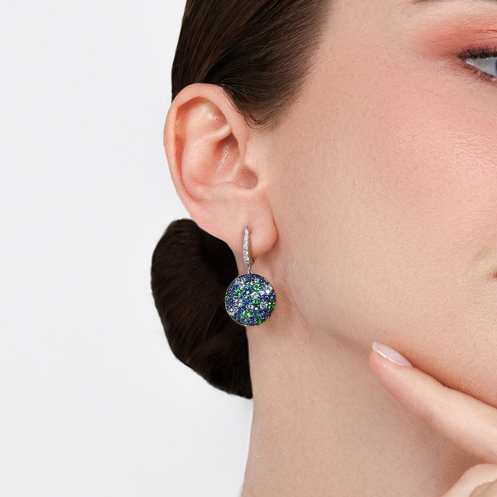 These earrings mirror the pendant’s arrangement of sapphires, blue topaz, and tsavorites—gemstones born of pressure, time, and mineral-rich stone. Set with diamonds, they are best worn alongside the matching pendant and ring.