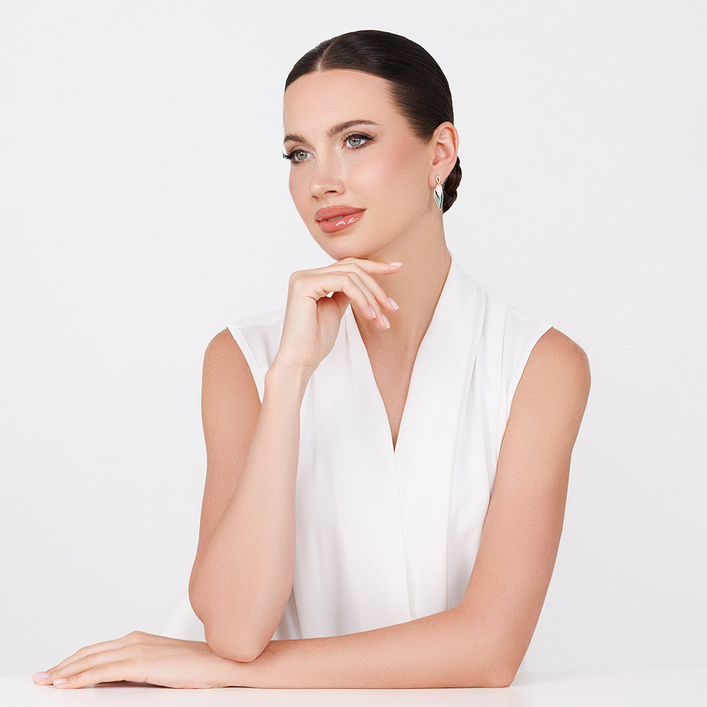 Introducing our 'Shapes Collection' - taking inspiration from the constructs that shape our everyday. A gold and diamond rim outlines the shape of two longer summer leaves, filled with the greener shades of malachite.