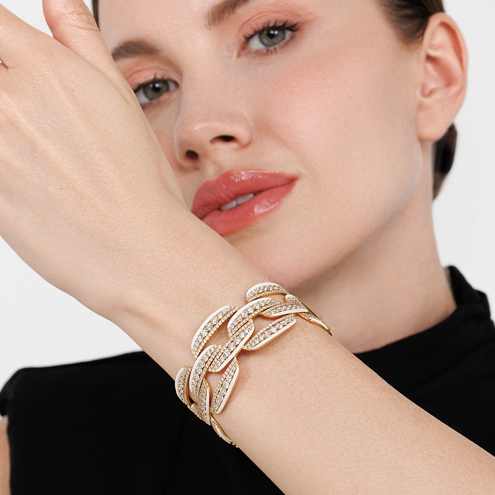 Round diamonds and gold interlock into a broader bangle that sits as a standalone piece on either wrist.