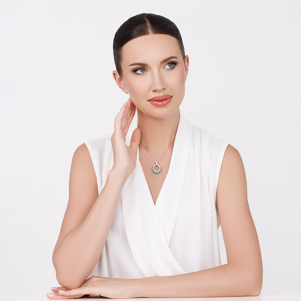 Introducing our 'Kaleidoscope Collection' - paying homage to our collection of pearls and birthstones. A broader, circular pendant of round diamonds, blue sapphire, and tsavorite.