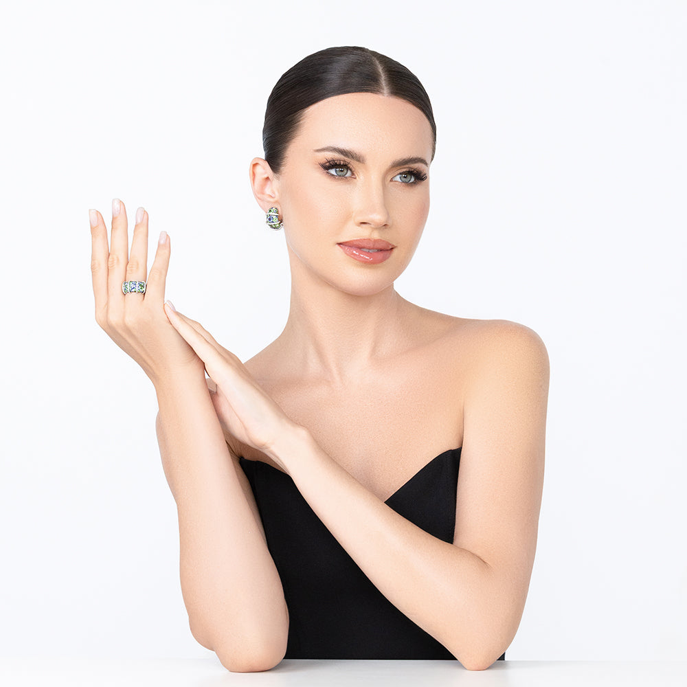 Introducing our 'Kaleidoscope Collection' – paying homage to our collection of pearls and birthstones. Alluding to the colors of Planet Earth – lines of round diamonds encase a pairing of blue sapphires and tsavorites, forming a small, but broadened, ring.