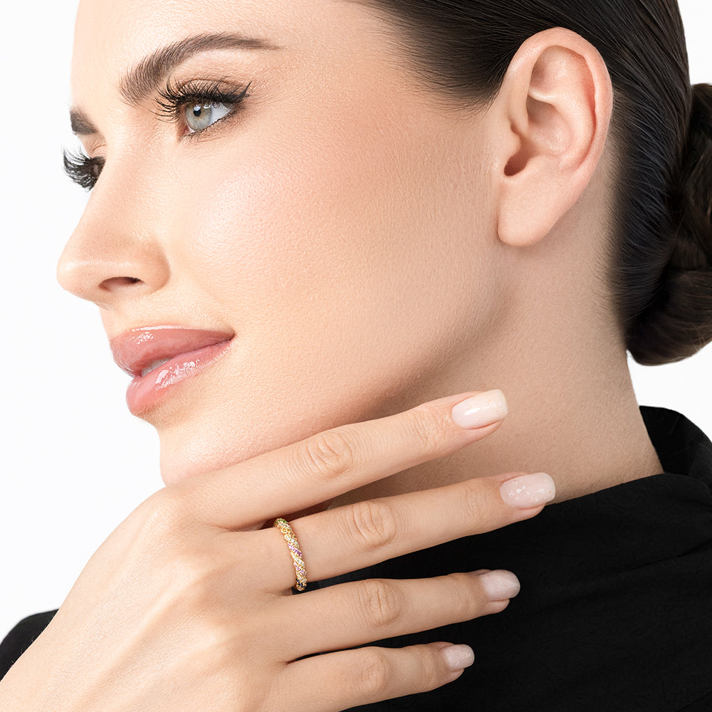 Introducing our 'Rainbow Collection' – a range of jewellery that champions the vibrant hues that color our world. This ring brings together round diamonds, garnet stones, and mixed sapphires in a vivid arrangement. A playful piece, and a timely addition to your everyday wear.