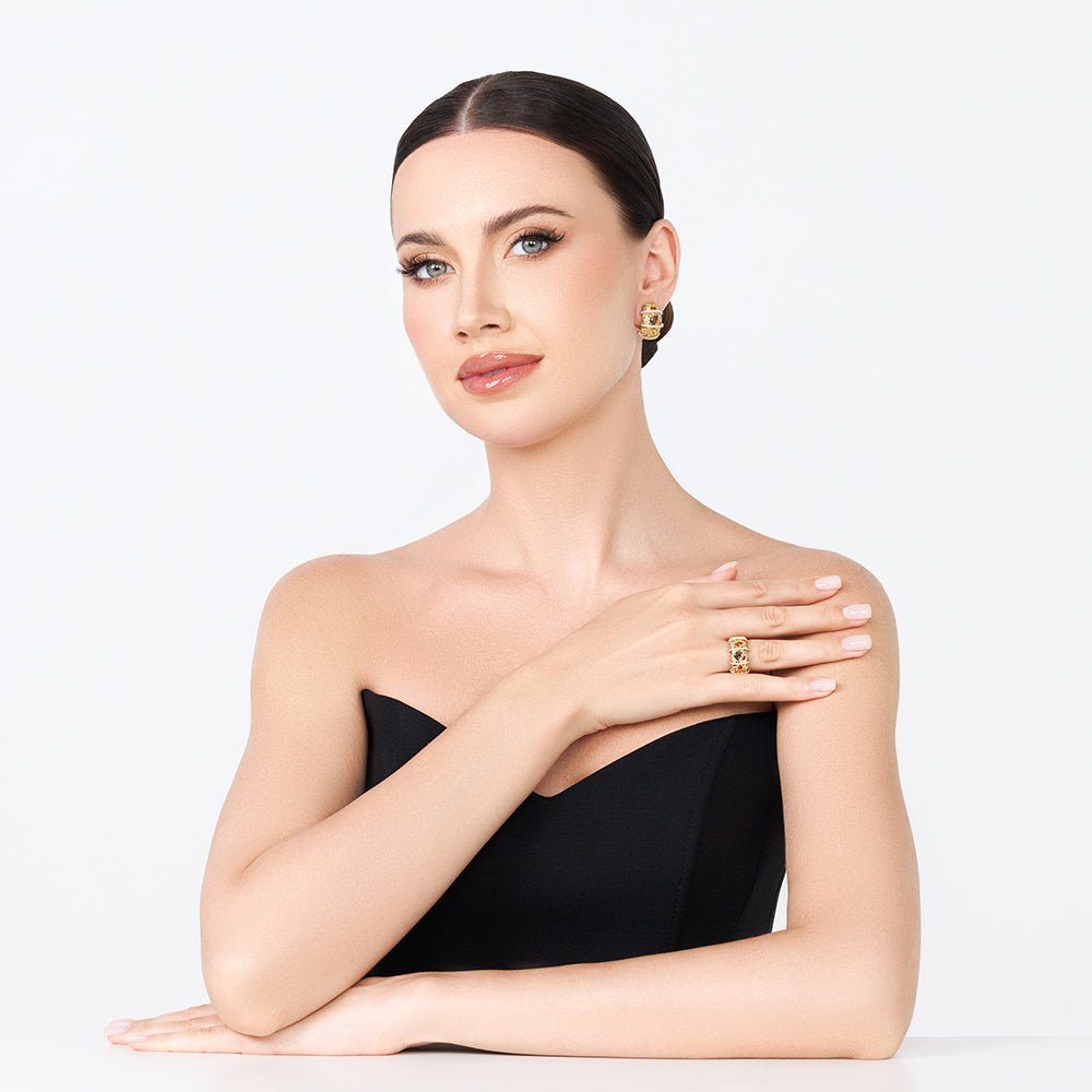 Introducing our 'Kaleidoscope Collection' – paying homage to our collection of pearls and birthstones. Alluding to the hues of a golden hour – lines of round and baguette diamonds encase yellow and orange sapphires, citrines, and quartz, forming a small, but broadened, ring.