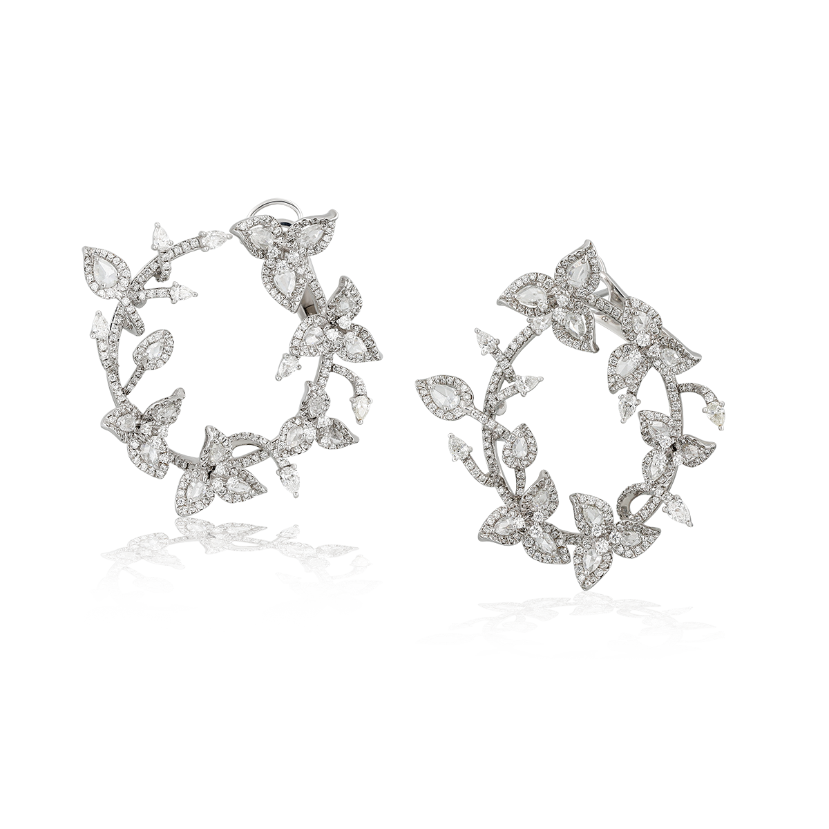 A carefully crafted mix of round, radiant-cut, and pear-shaped diamonds form these unique earrings. Whether viewed up close or from afar, the design evokes a forest like charm — an interplay of diamond cuts that allude to delicate, leaf-like structures.
