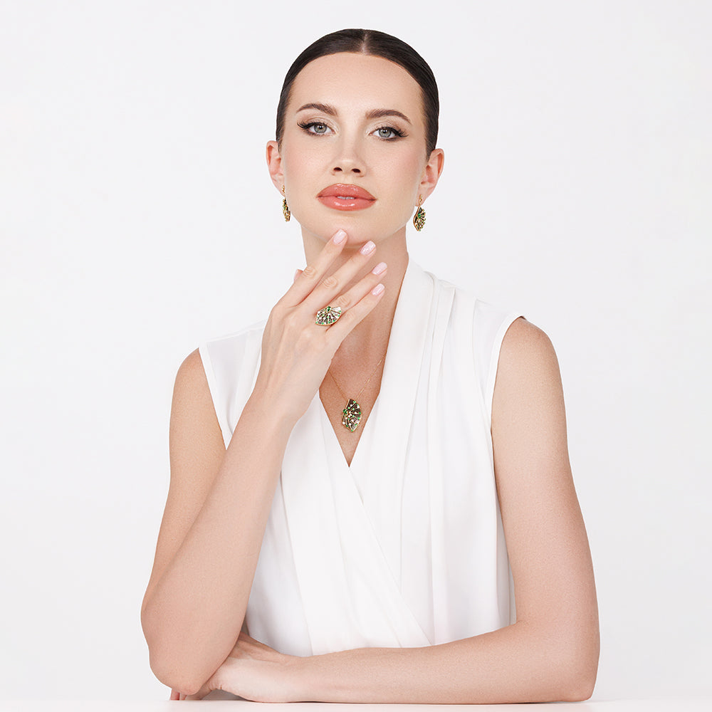 Introducing our 'Shapes Collection' – taking inspiration from the constructs that shape our everyday. Mother of Pearl forms the base, and silhouette, of this leaf construct. Round diamonds and tsavorites enact the stems of a leaf in this pendant – bringing the shape to life.