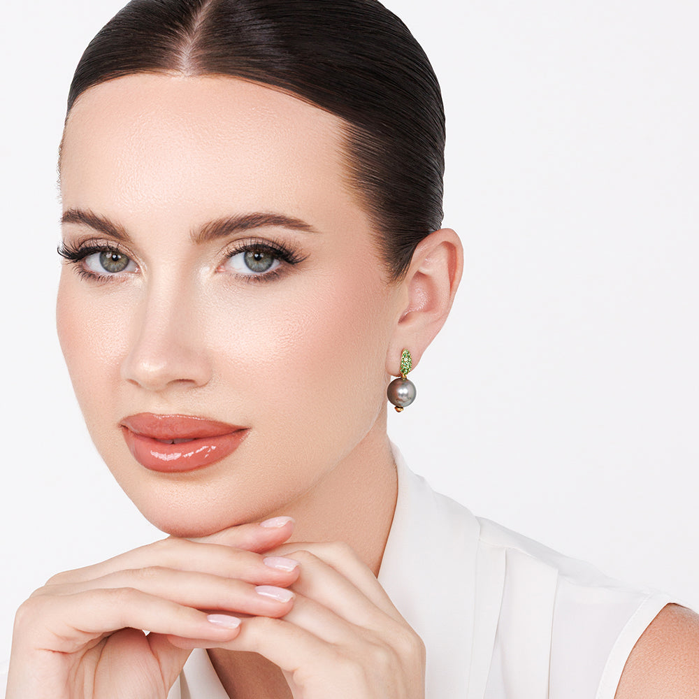 Introducing our 'Kaleidoscope Collection' – paying homage to our collection of pearls to birthstones. Tsavorite stones and pink tourmalines frame gray pearls in this coloured take on a classic pair of earrings.