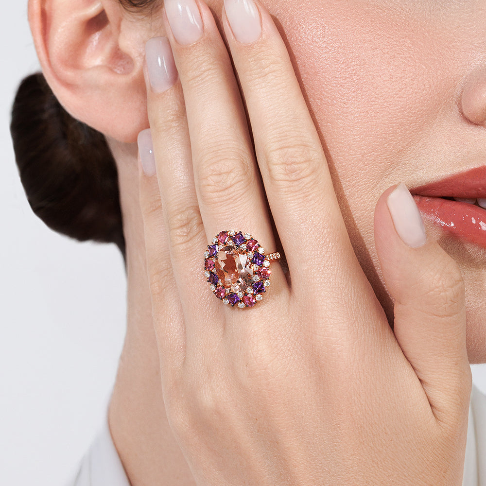A 5-CT morganite takes center stage in this ring, framed by diamonds, amethyst, and pink tourmaline in perfect symmetry. Completes the trio when paired with the matching pendant and earrings.