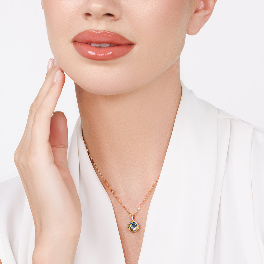 Introducing our 'Kaleidoscope Collection' - paying homage to our collection of pearls and birthstones. A cluster of round diamonds, blue and yellow sapphires, tsavorites, blue topaz, and peridots take form in this pendant that adds color to your everyday.