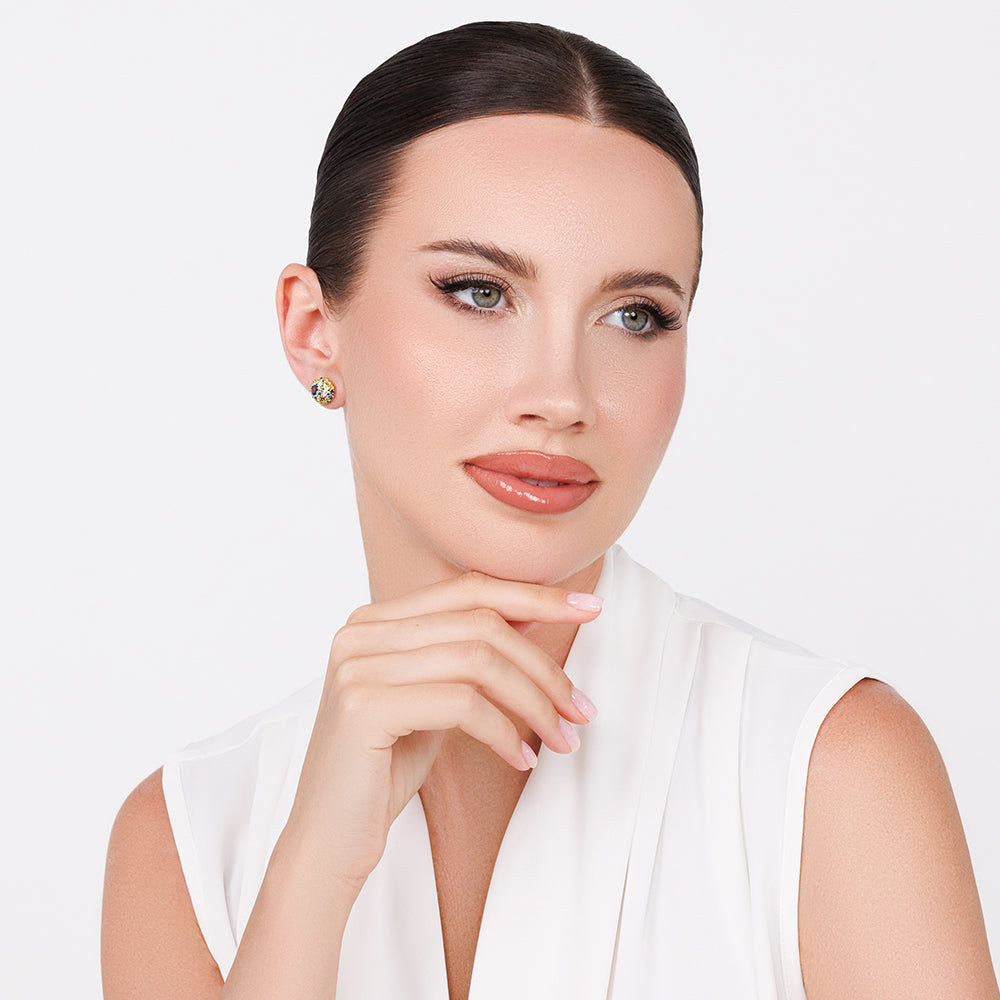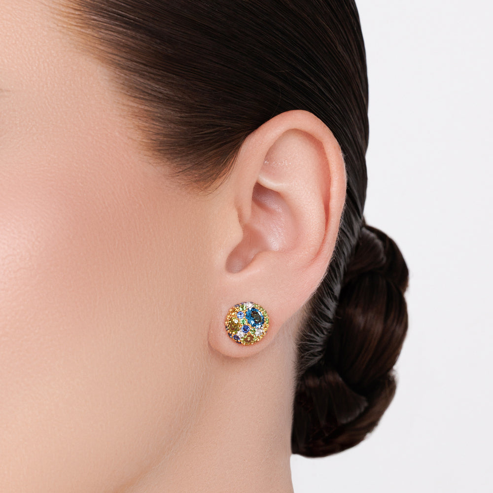 Introducing our 'Kaleidoscope Collection' - paying homage to our collection of pearls and birthstones. A varying arrangement of blue, yellow sapphires, tsavorites, blue topaz, peridots, and round diamonds allude to coloured crystals in this pair of stud earrings.