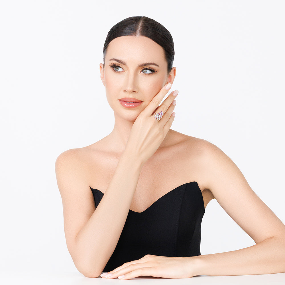 A floral arrangement of marquise diamonds and single stone pink sapphires blossom in this ring.